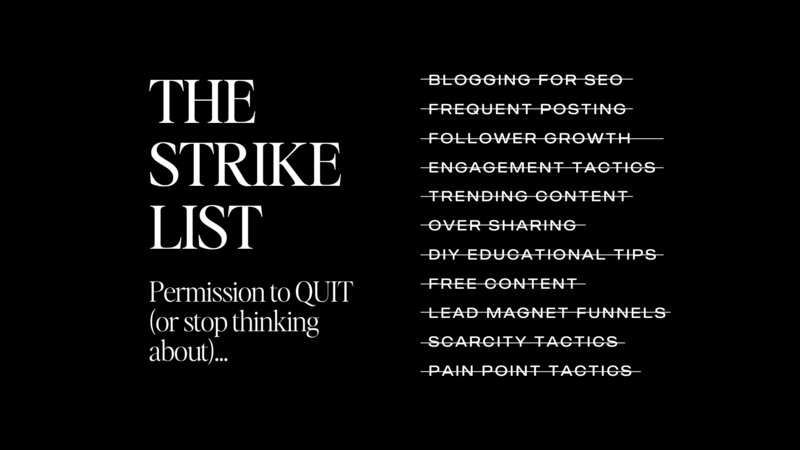 1) The Minimalist Marketing Masterclass. This class covers popular marketing advice that does not work for booking in-person wellness services and why (The Strike List). Followed by a clear plan for what does work to book in-person services, classes, workshops, and retreats.